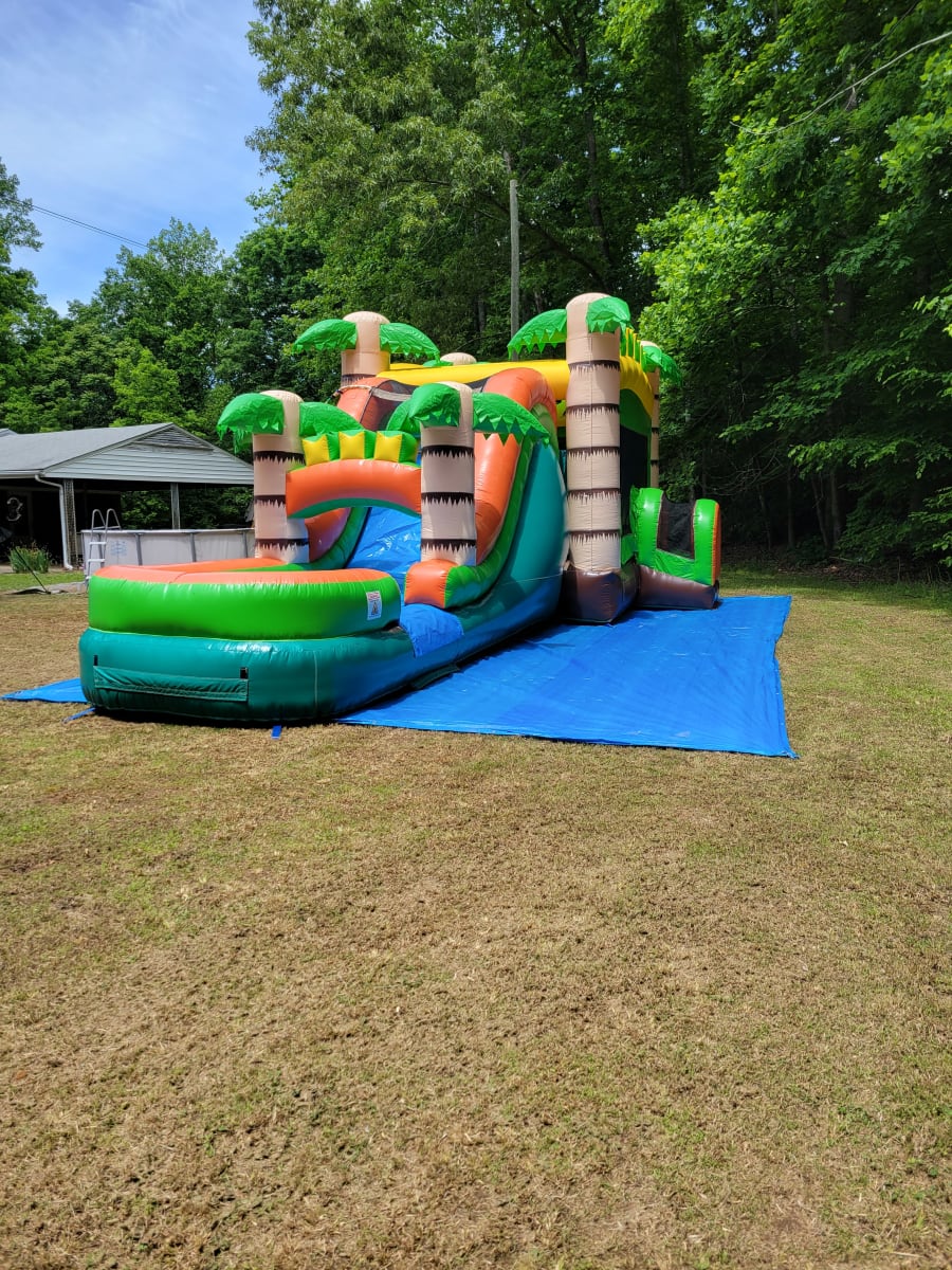 32' Long tropical bounce house, spacious 15x15 jumping area and attached is a 6.5 foot slide, colorful palm trees provides attraction to your guest. This unit has a sprinkler system and an inflated landing strip with stopper and integrated splash pad for safety, bright neon color accents. Welcome to the jungle!