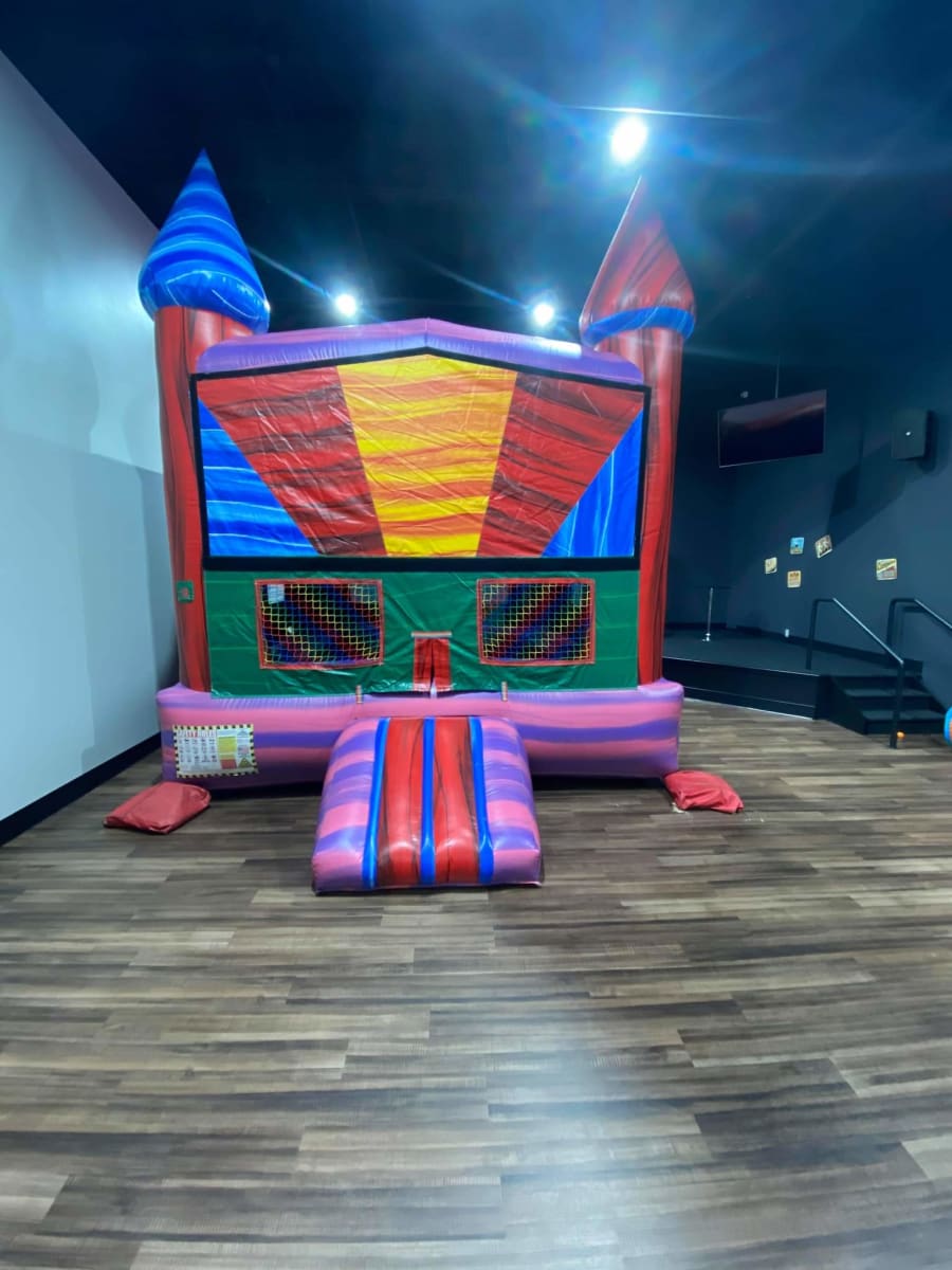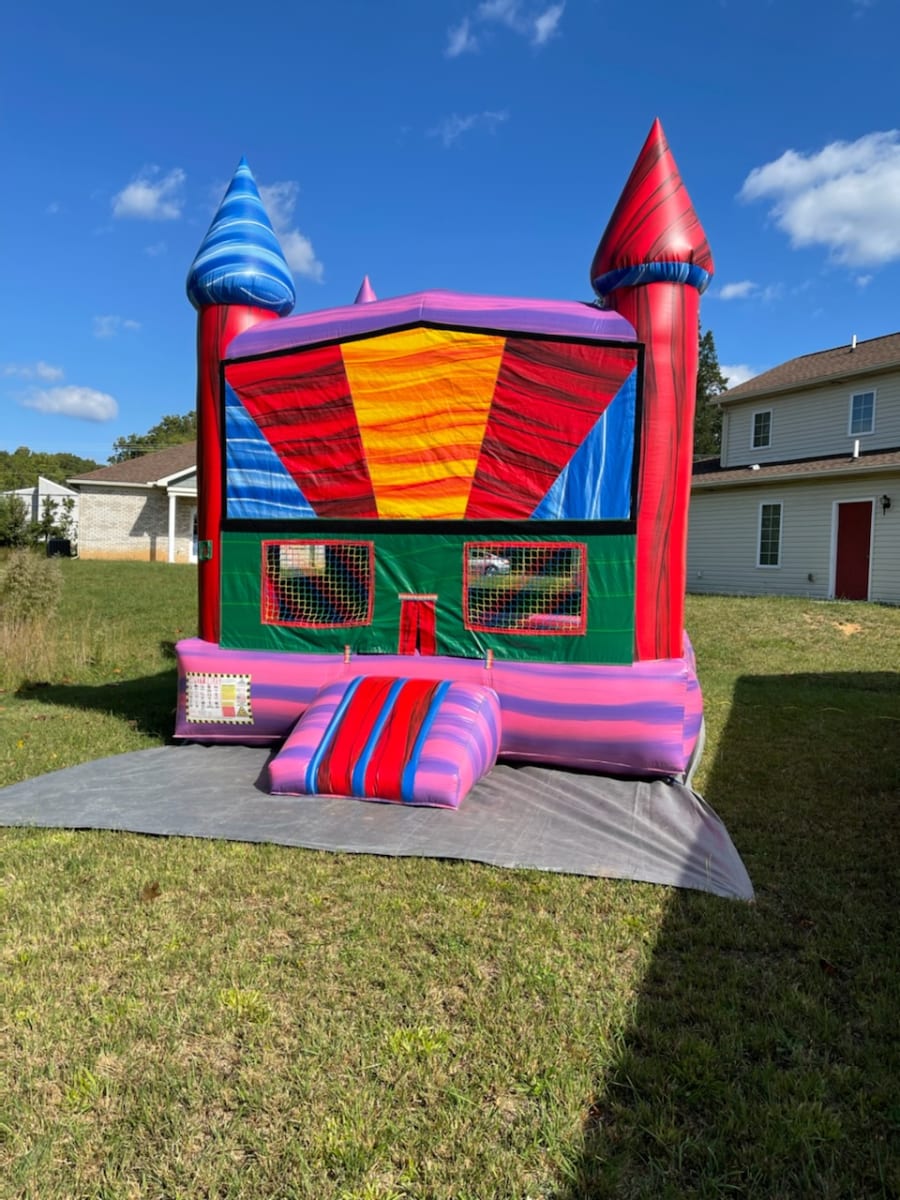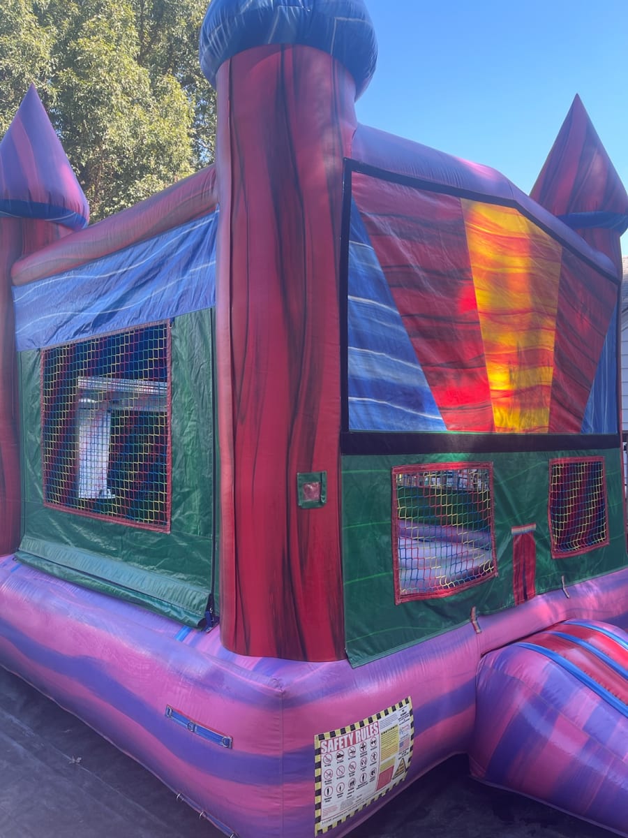 This bouncy castle has a lot of color bringing your party to life! Marble colors with a 13x13 bouncing area and basket ball hoop ensures hours of fun and will bring smiles to all your little guest. Universal colors with marble striping can be booked for boys or girls, this is a great option to be used inside for the colder months.