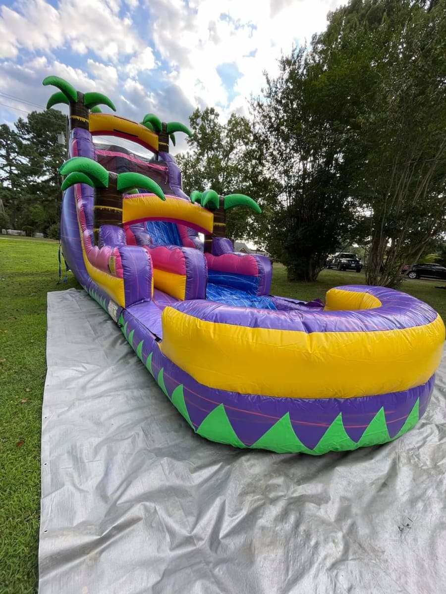 New to the Magic Bounce family, introducing the 18ft Starburst water slide! This unique slide has bright colorful purple and pinks and palm trees at the peak, this slide gives tropical vibes. Our Starburst slide is fun for all ages and can be used all summer long!